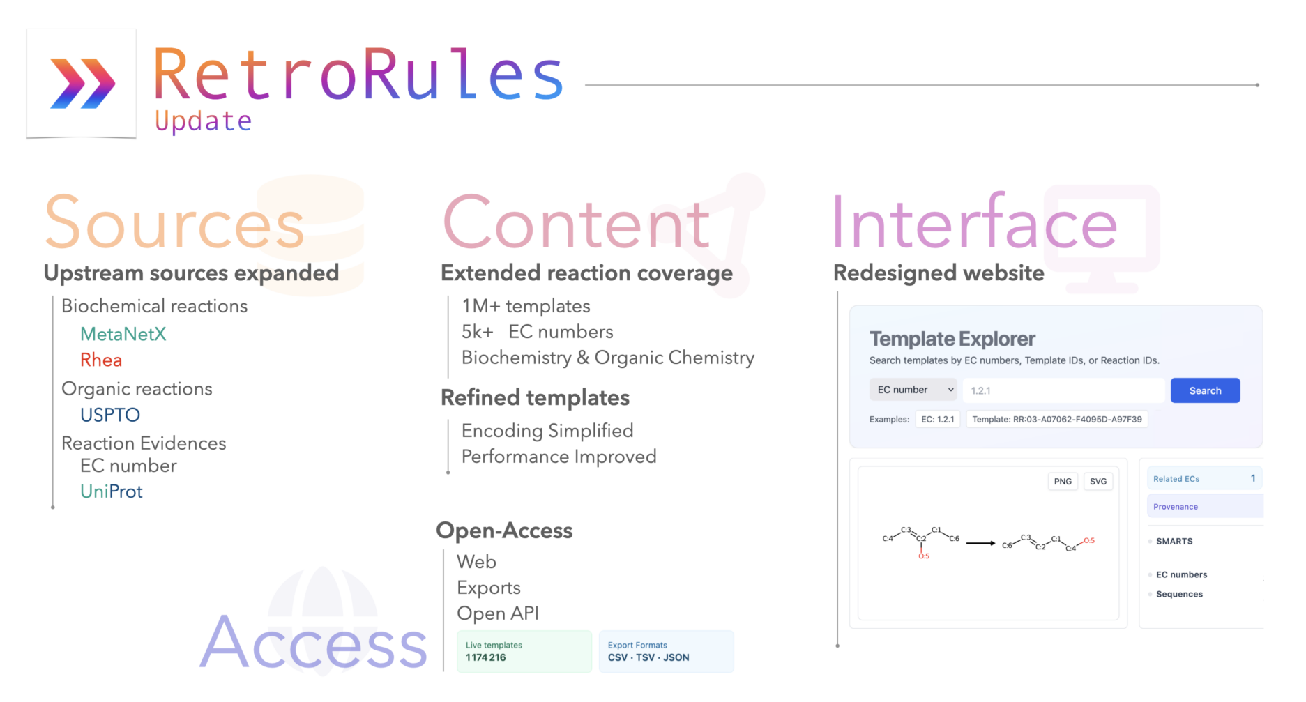 RetroRules is a database of reaction rules for metabolic engineering (). Reaction rules are generic descriptions of chemical reactions that can be used in retrosynthesis workflows